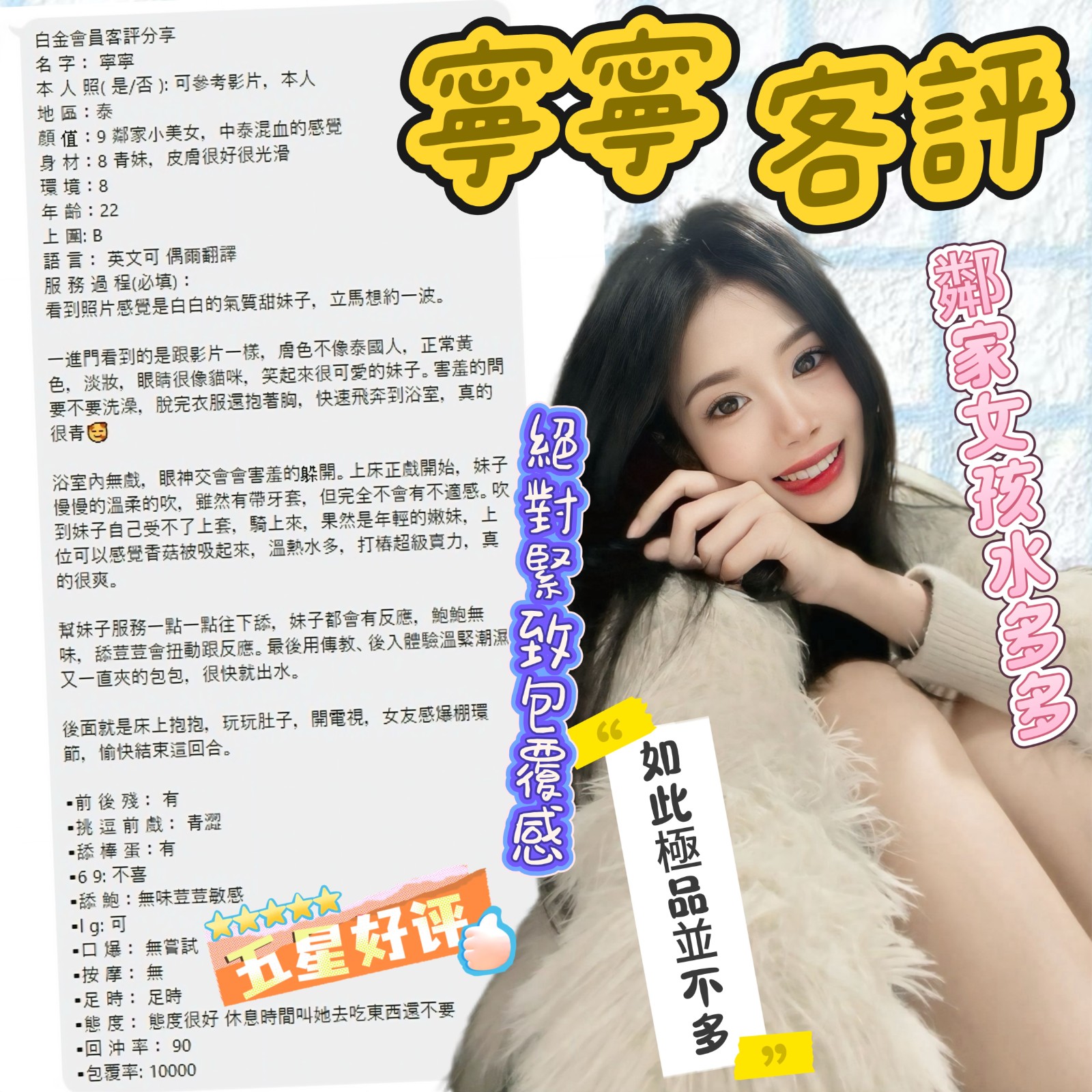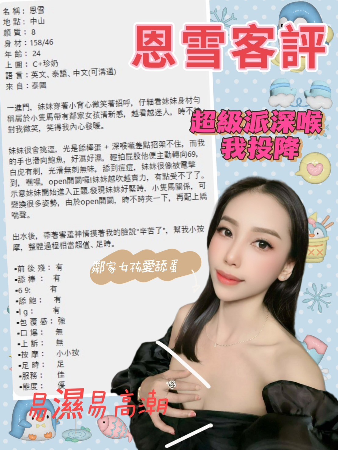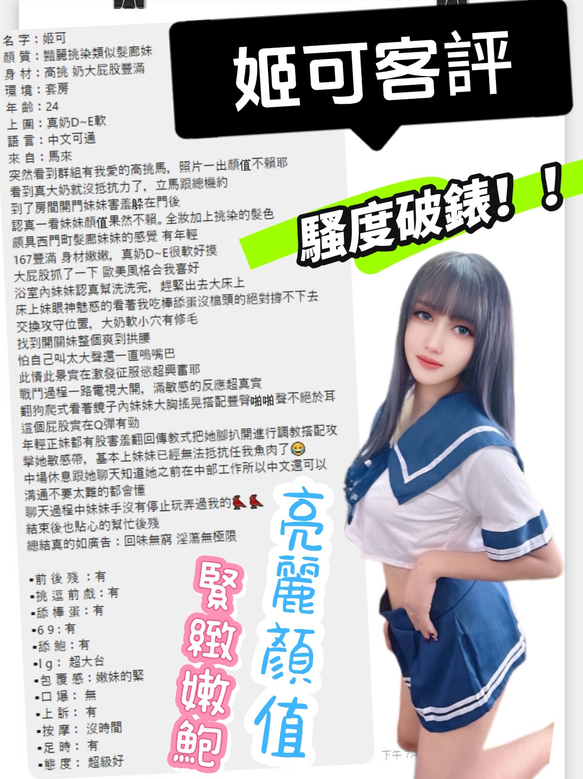 殘廢澡 奶洗浴 深喉嚨 無套吹 舌吻(視清潔度) 品鮑 69 冰火 水中蕭 按摩 奶炮 過水 漫遊 胸推 臀推 足交 絲襪愛愛(需自備) 穿高跟鞋愛愛(需事先告知) 顏射+500 口爆+500 無套+1000(可內射) 可30分 可2S 可兼90分(一天限量3班) 可2+1(買兩節50分鐘送20分鐘+1S) 可3+1 可包夜(4+2/5+3)