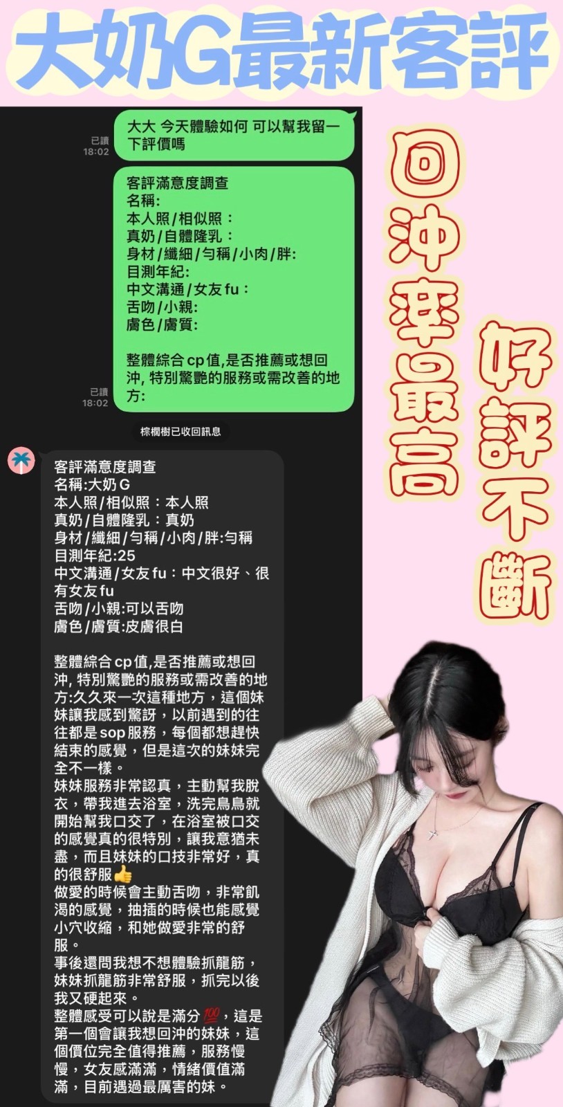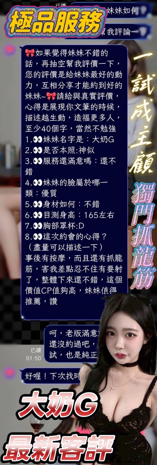 服務項目:共浴/無套吹/舌吻(視口腔清潔)/小親親/按摩/乳交/足交/舔蛋舔睪丸/舒麻舌功/品鮑/69/角色扮演(性感內衣)…